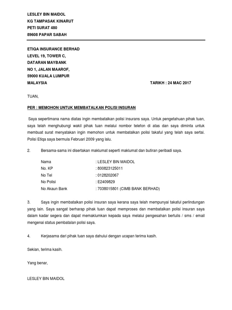 Cara Pembatalan Polisi Insurans Takaful Dan Contoh Surat Memohon Pembatalan. Kelurahan melodi indah kecamatan musik kaler. Anda dibenar untuk membawa.